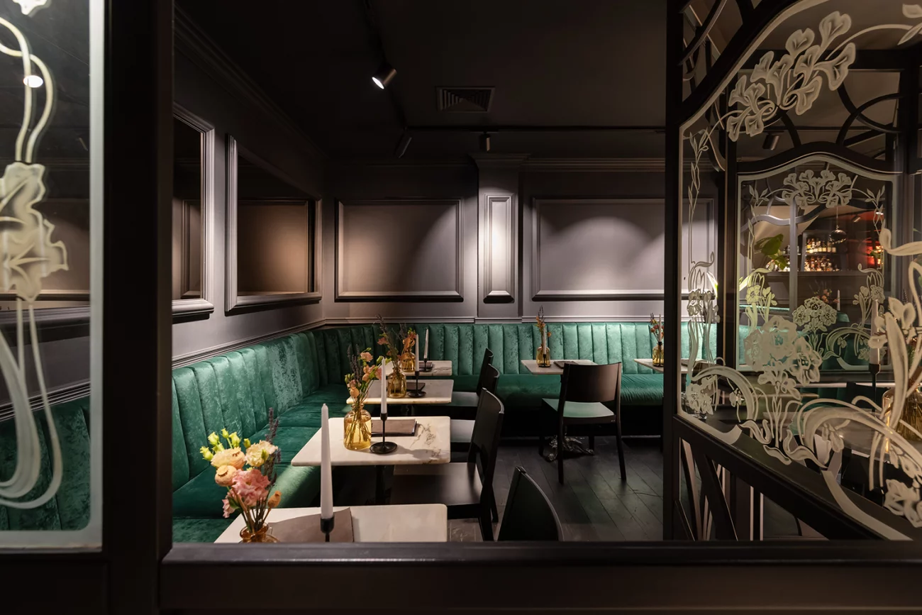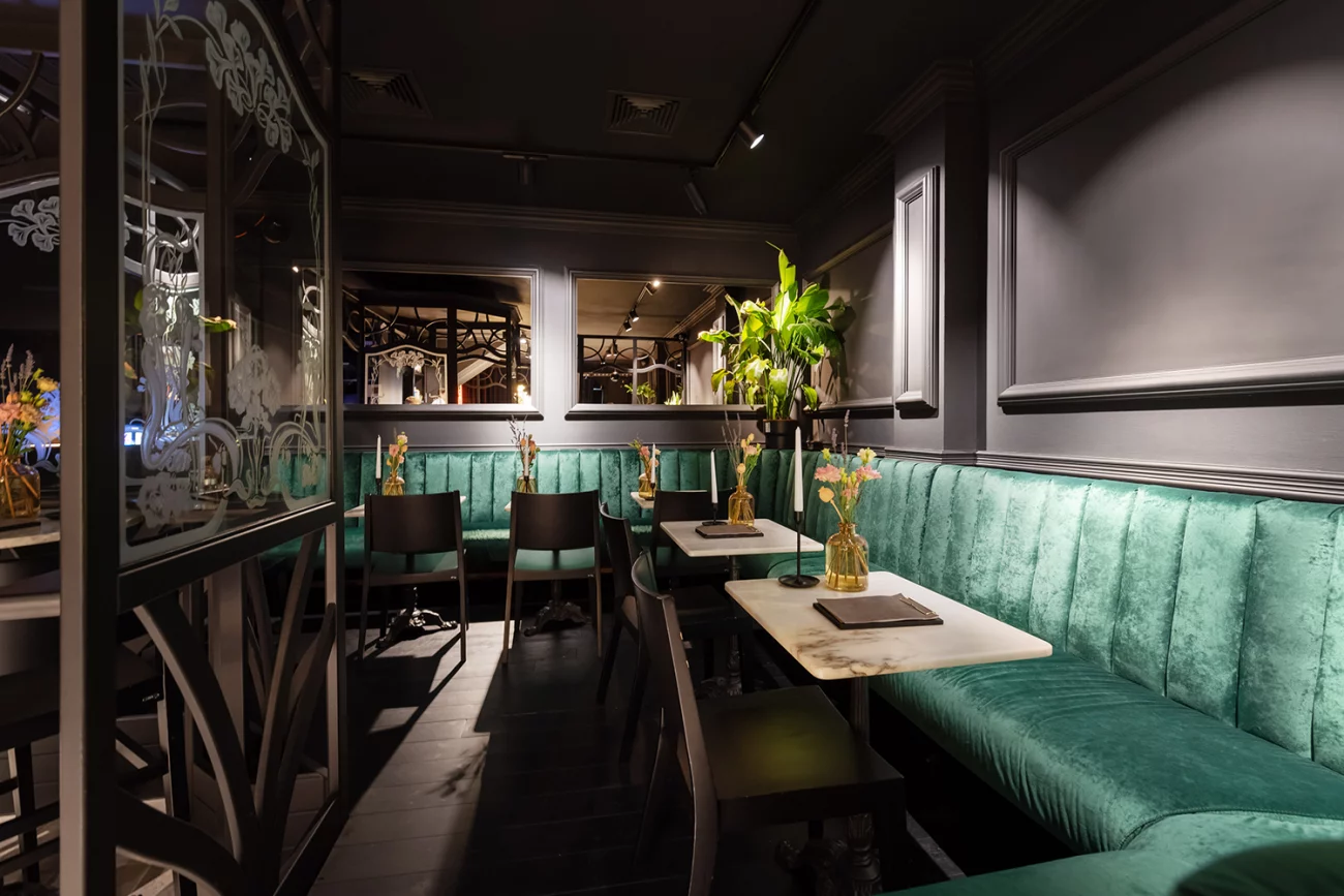 Die Bar ist klar strukturiert, sodass verschiedene Bereiche für unterschiedliche Aufenthaltsqualitäten entstehen. Offene Sitzbereiche wechseln sich mit intimeren Nischen ab, wodurch sowohl kommunikative als auch ruhige Zonengeschaffen werden. Die Theke fungiert als zentraler Bezugspunkt und strukturiert den Raum gleichzeitig.